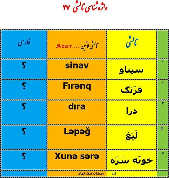 Ramezan Niknahad درود بانو صبا می دانم که برخی واژه ها مختص گویش های محلی زبان تالشی است . به همین جهت انتظار این نیست که همه تالشها کاملن مسلطبه گویشهای مختلف زبان تالشی باشند . مورد 5- ازگَر در بالای گ فتحه دارد چون شما متوجه فتحه آن نشدید واژه ازگر که گ بدون فنحه را به درستی معنا نمودید برای راحتی در فهم هریک از واژ ها من با هریک یک جمله تالشی میسازم 1- ایی تاخَه آو مع بدَه تِشیری سیمَه 2- خَرو ترشی ، پاتیلَه کا تلاخَه کَرده دییاری پبَه 3- پرزَه گلَه کی یا ک آبا ام وَراَوَری دییِسی 4 – ایی وَرار ایزم بواَر آتَشی کا دَکَه 5- کرجی کع آتَش آگِتَه ، چِه ازگَر دا آسمو ن شا