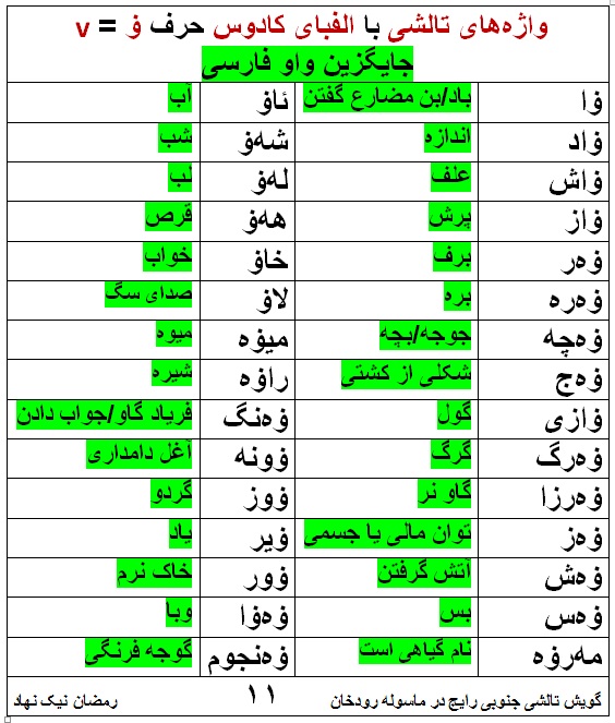 جدول11 واژههای تالشی با الفبای کادوس حرف ۏ = v