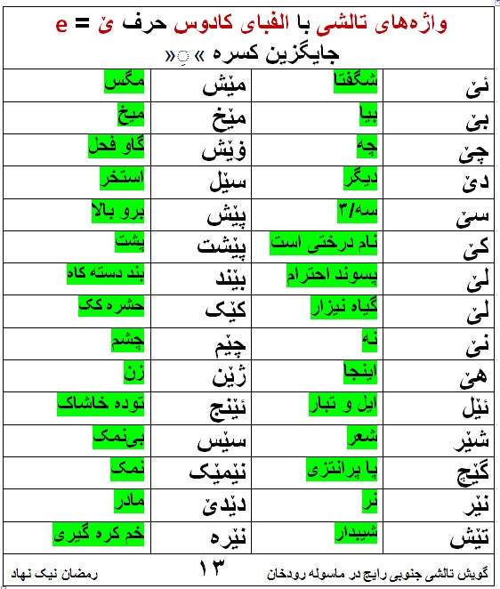 واژههای تالشی با الفبای کادوس حرف ێ = e جایگزین کسره «ِ » جدول 13